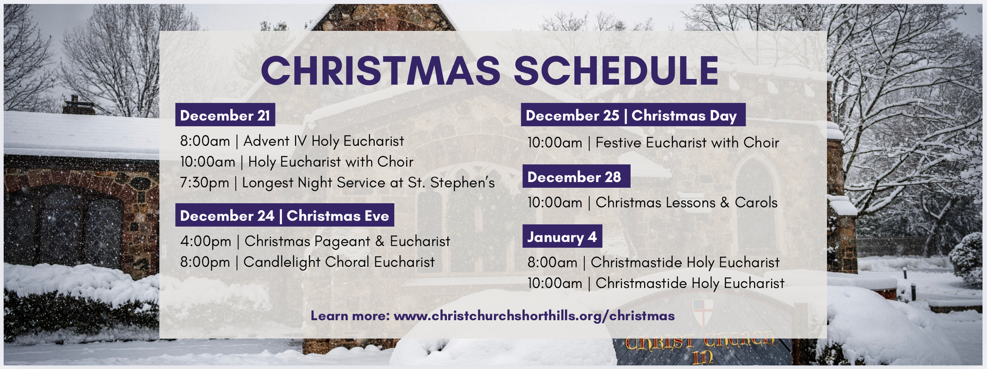 Celebrate with us on Christmas morning for Holy Eucharist with choir. All are welcome! Music during the service will include works from Willcocks and Williams. The Rev. George Dredden will preach and Dr. Andrew Moore will perform voluntaries to the work of Marcel Dupre and J.S. Bach. Learn more.